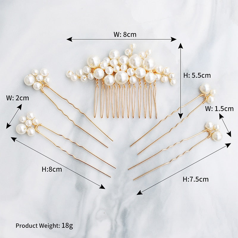This high-quality 5-piece set of handmade pearl bridal hairpins is the perfect accessory for your special day. Crafted from durable material with gold-plated accents, these hairpins will stay in place to complete your elegant hairstyle. Securely attached to a comb, these pins will keep your hairstyle in place while adding a touch of glamour. Treat yourself to this versatile and beautiful set of pearl wedding hairpins.