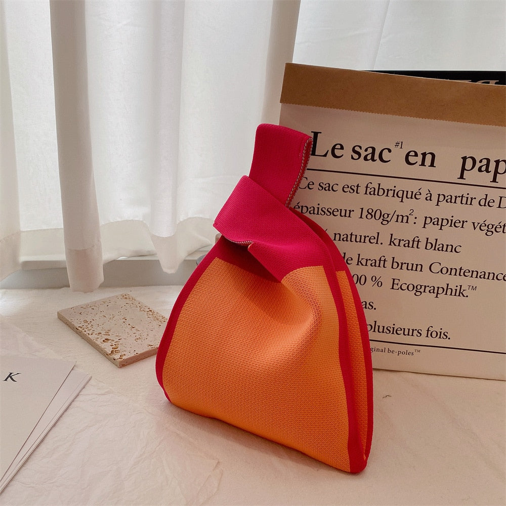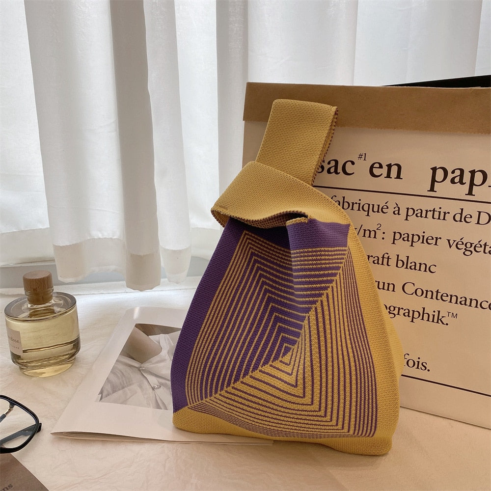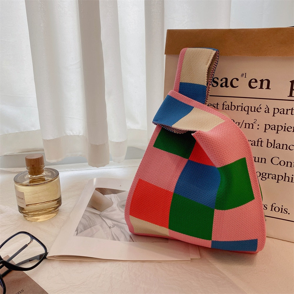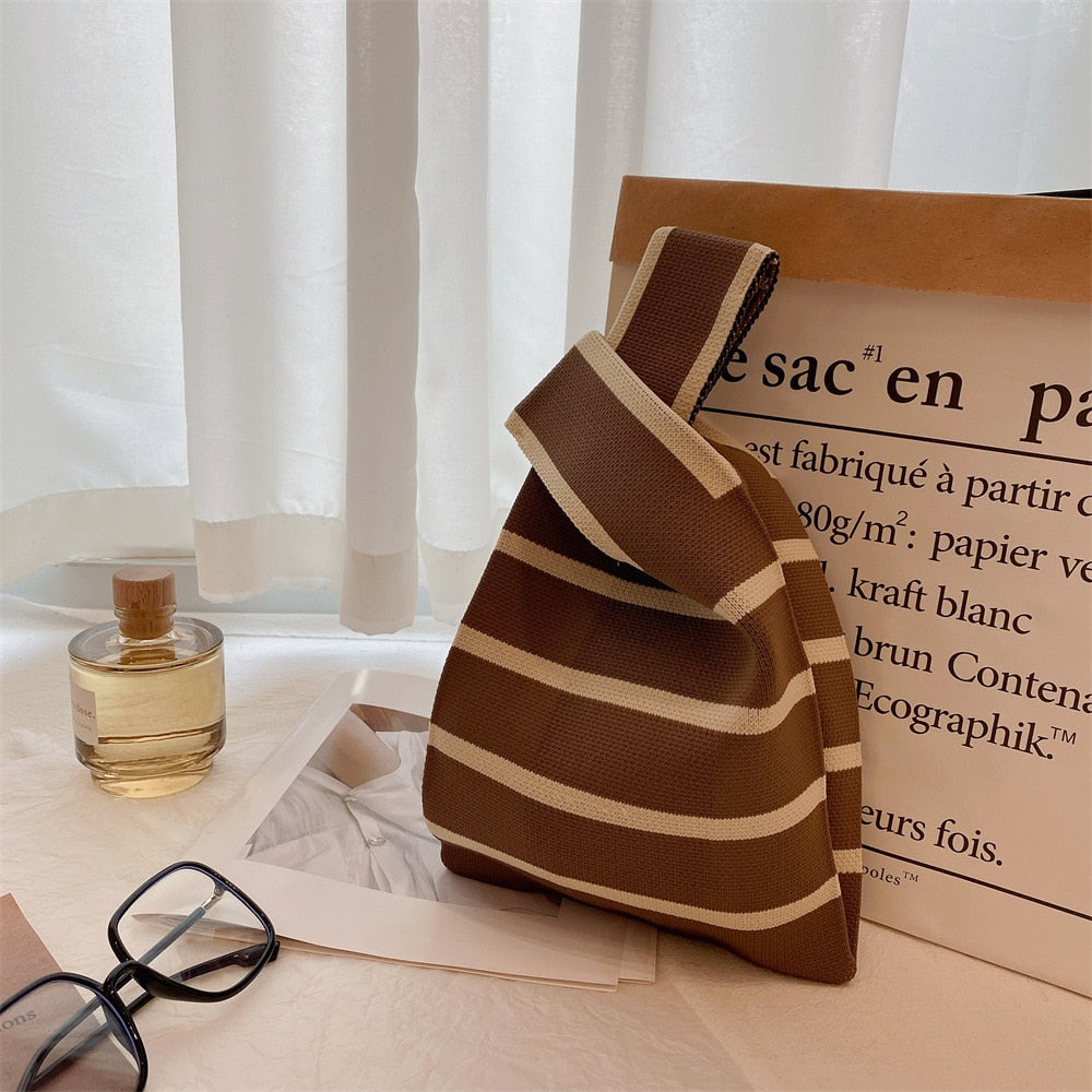 Description: Handmade Knit Handbag Women Mini Knot Wrist Bag Japanese Casual Color Wide Stripe Plaid Tote Bag Student Reusable Shopping Bags